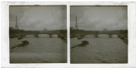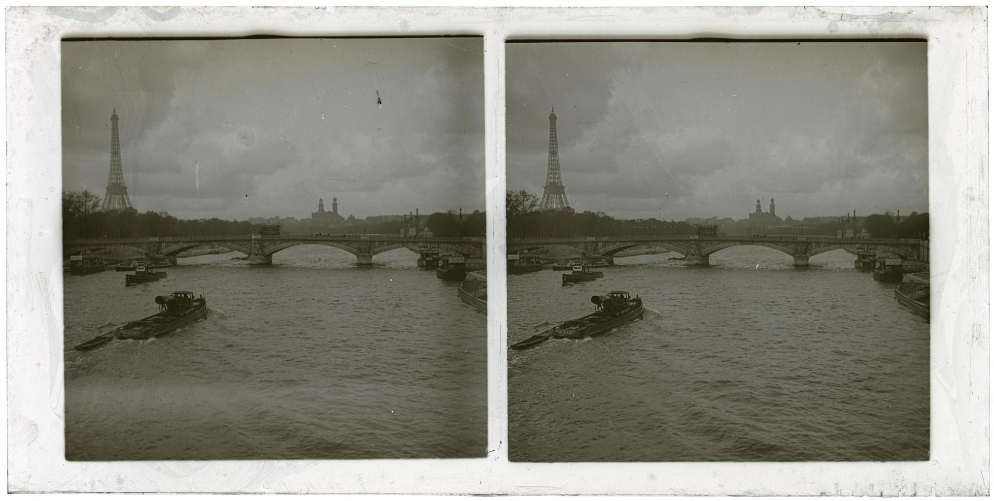 Vista del puente de los Inválidos sobre el río Sena, tomada desde el puente de Alejandro III en el este, en París. En primer término el río y una barcaza navegado con el letrero VIGILANT. En la derecha, barcos atracados en la orilla, uno con el cartel "CHOCOLAT / MENIER". En segundo plano, el puente y, detrás, la torre Eiffel. Al fondo, las torres del palacio de Trocadero.