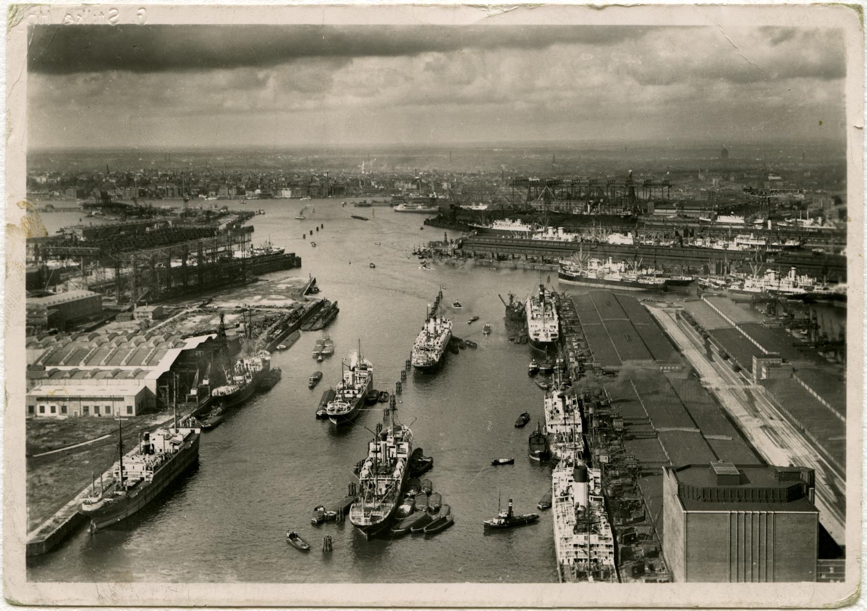 En el reverso, marcas de tarjeta postal y texto impreso: Hammburg. Deutschlands grösster Hafen. Photo Hans Hartz, Verlag Hans Andres Hamburg. Texto manuscrito de Martín para Santos Laspiur, fechado en Hamburgo el 12 de enero de 1951.