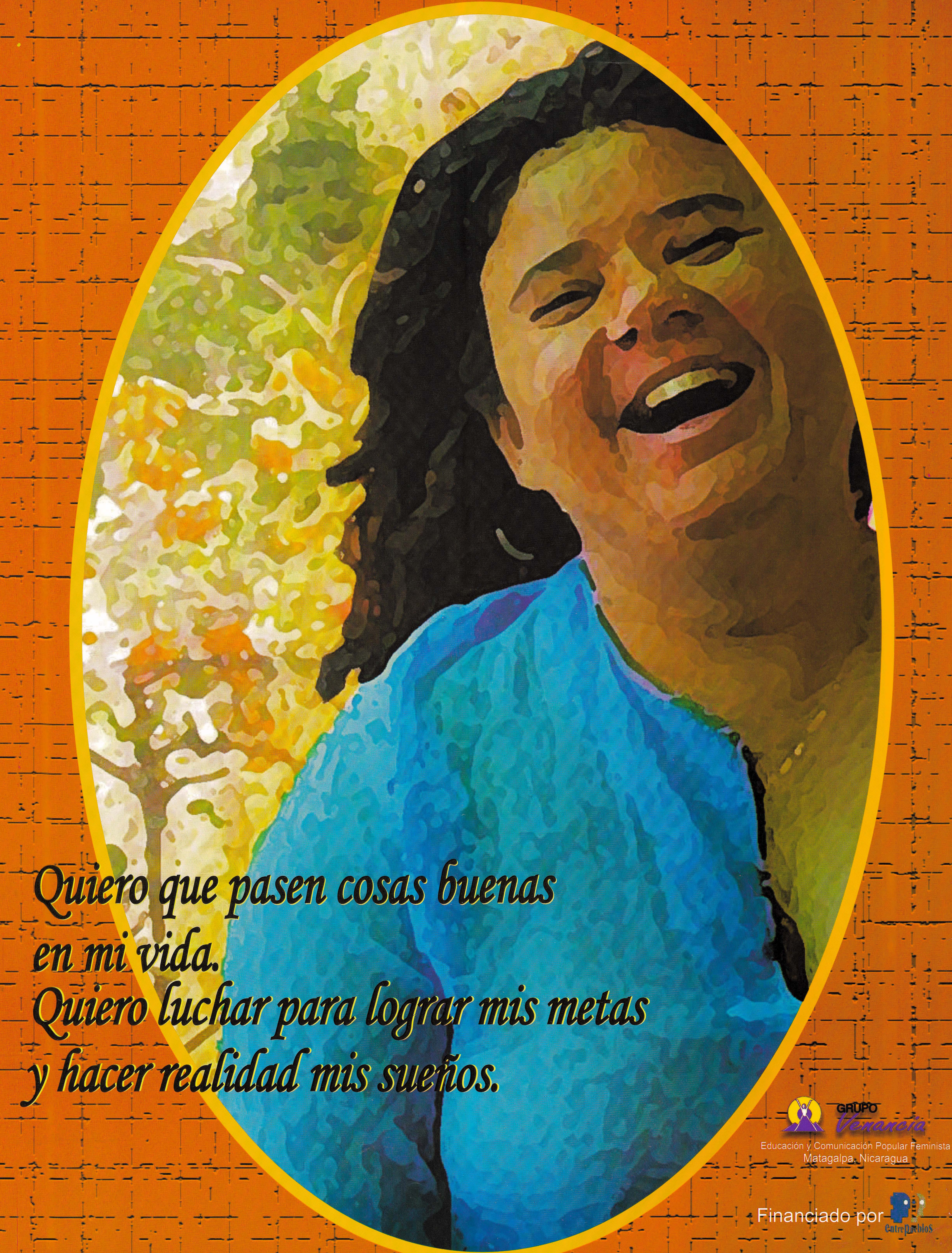 Cartel del Grupo Venancia, organziación de muejres de Nicaragua, que recoge un poema y muestra la ilustración de una mujer sonriendo. El cartel apunta que la finanación corre a cargo de Entre Pueblos, organización de cooperación internacional centrada en América Latina que nació en el año 1988 en Barcelona. El Grupo Venancia nació en 1991 y Entre Pueblos en 1988.
