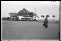 Escena de Ramona Erro Cía, mujer de José Martínez Berasáin, con un hombre en el paseo de Poniente de Valencia. En segundo término la marquesina de tranvías diseñada por Carlos Blanco, en la rotonda de Caro.