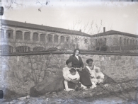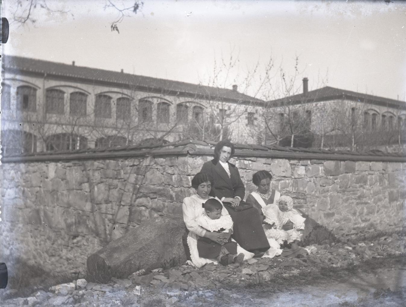 Retrato de grupo familiar. En en centro, sentada, Ramona Erro, mujer de José Martínez Berasáin; a su derecha, una mujer con Luis Martínez Erro en su regazo; a su izquierda, una niñera sujeta a Margarita Martínez Erro. En segundo plano, un muro de piedra y, al fondo, un edificio del Hospital Psiquiátrico de Pamplona.