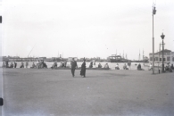 Retrato en plano entero de Ramona Erro, mujer de José Martínez Berasáin, en el puerto del Grau de Valencia. En el centro de la imagen Ramona, de espaldas, junto a un hombre, en segundo plano 33 hombres pescando y contemplando la pesca, en la derecha el antiguo edificio del laboratorio portuario, al fondo, otros edificios del puerto como el varadero.