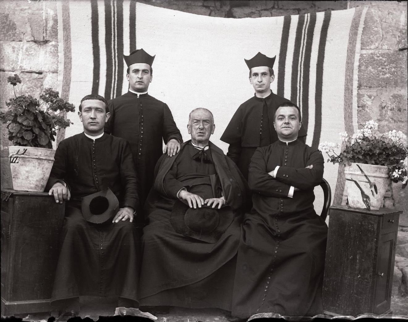 Retrato en plano entero de 5 sacerdotes, dispuestos en 2 filas. En la primera, 3 sacerdotes sentados, el primero de la derecha, Alberto Oficialdegui Núñez. En la segunda fila, 2 sacerdotes de pie. A ambos lados, 2 mesillas con sendas macetas con geranios. Detrás una manta colgada a modo de fondo de escena.