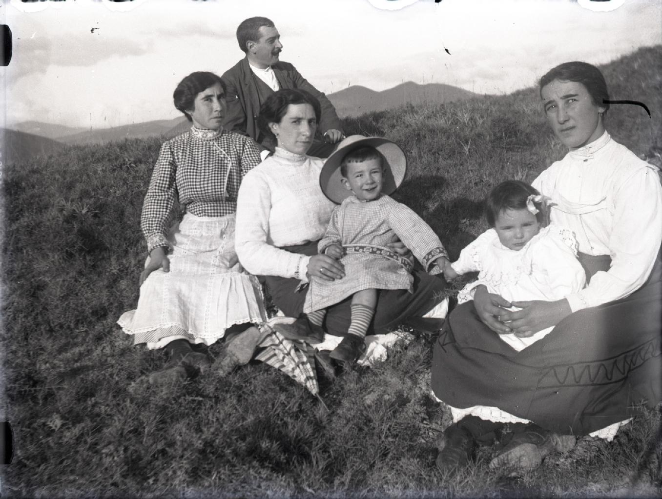 Retrato de grupo de la familia Martínez Berasáin, tomado durante una excursión al alto de Ezcaba celebrada con motivo de la festividad de la Virgen del Pilar. En el centro, Ramona Erro sentada con su hijo Luis en su regazo y, tras ella, un hombre y una mujer. A la derecha, otra mujer con Margarita, hija de José y Ramona, sobre el regazo.