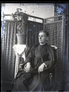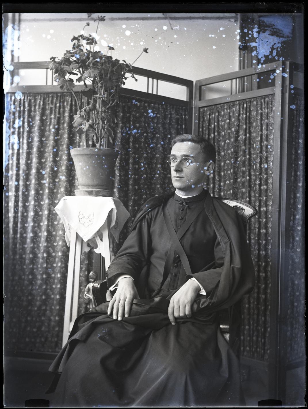 • Contenido: Retrato en plano americano de un sacerdote con sotana y capa sentado junto a una peana con una planta. De fondo, un biombo.