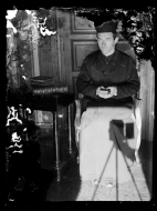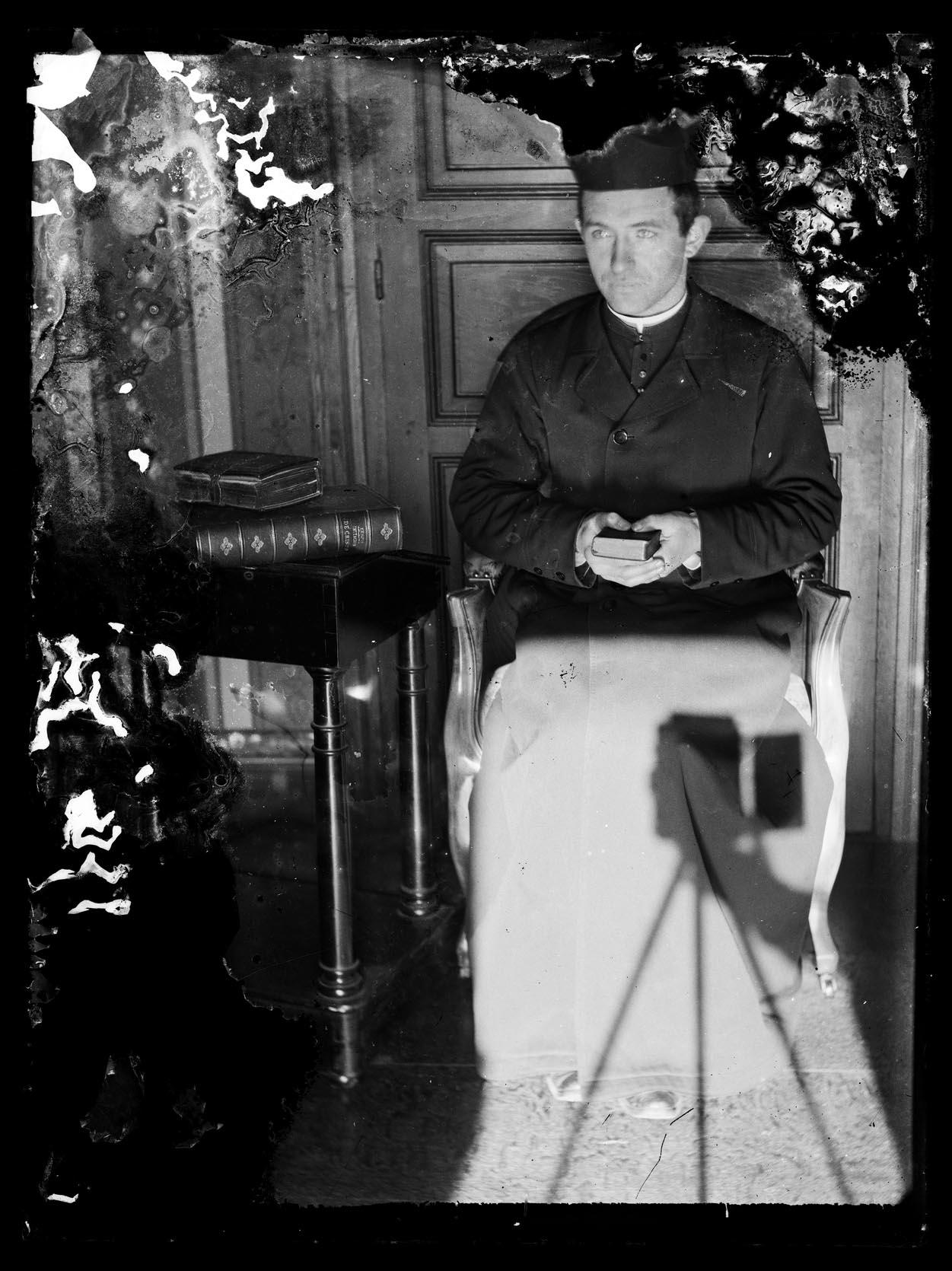 Retrato en plano entero de un sacerdote con birrete con un libro en la mano sentado en un sillón junto a una mesa con dos libros, uno de ellos "Imitación de Cristo" de Kempis. Sobre la parte inferior del abrigo, la silueta de la cámara fotográfica sobre el trípode.