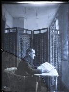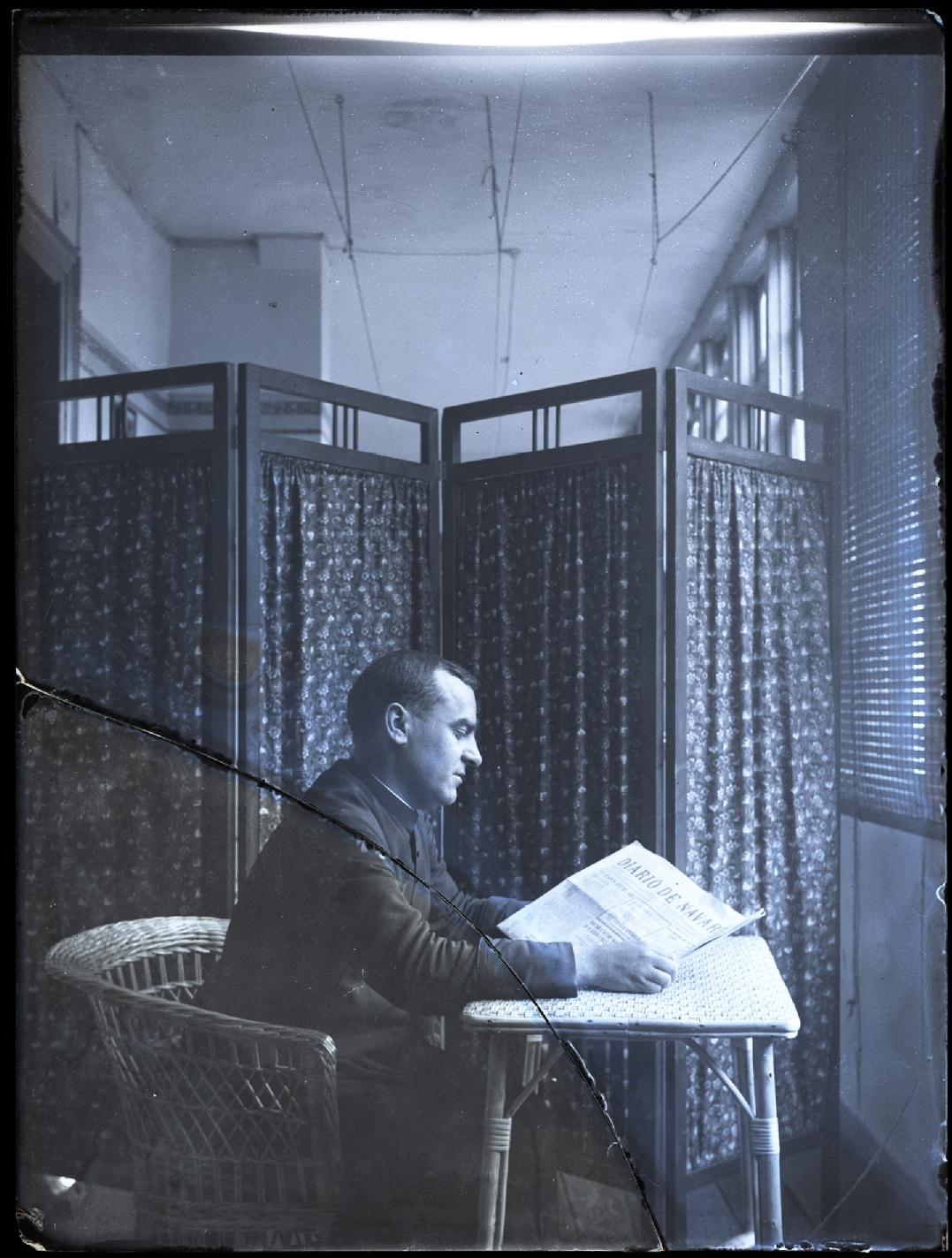 • Contenido: Retrato de perfil en plano americano de un sacerdote sentado en la mesa leyendo el Diario de Navarra. De fondo, un biombo.