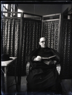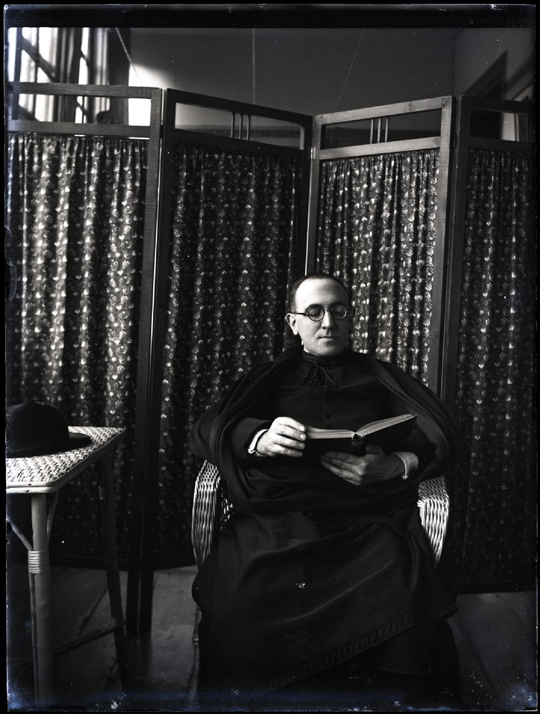 • Contenido: Retrato en plano americano de un sacerdote sentado leyendo un libro. De fondo, un biombo.