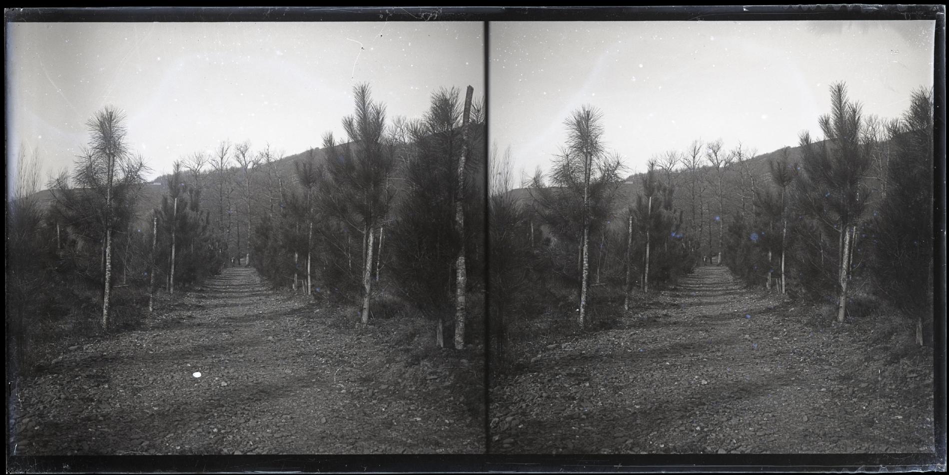 • Contenido: Vista de un camino entre pinos de repoblación en un entorno de montaña.