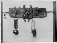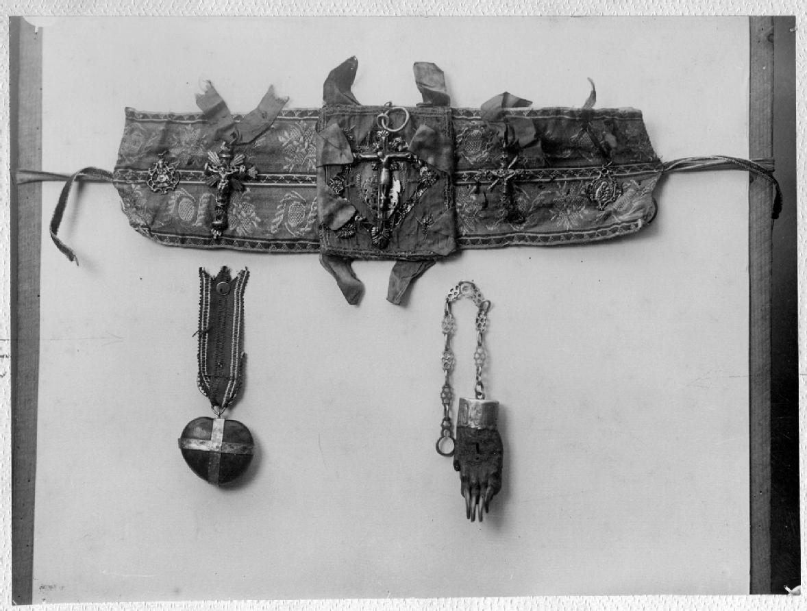 Vista general de un grupo de amuletos y talismanes profilácticos tradicionales elaborados y utilizados en Navarra. Arriba, una faja para cristianar, denominada "paxia", decorada con 3 crucifijos y 2 medallas. Abajo, a la izquierda, un colgante con castaña de Indias montada en plata, procedente de Narvarte; a la derecha, una garra de tejón engastada en plata, con cadena, procedente de Riezu.