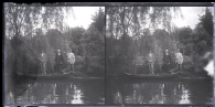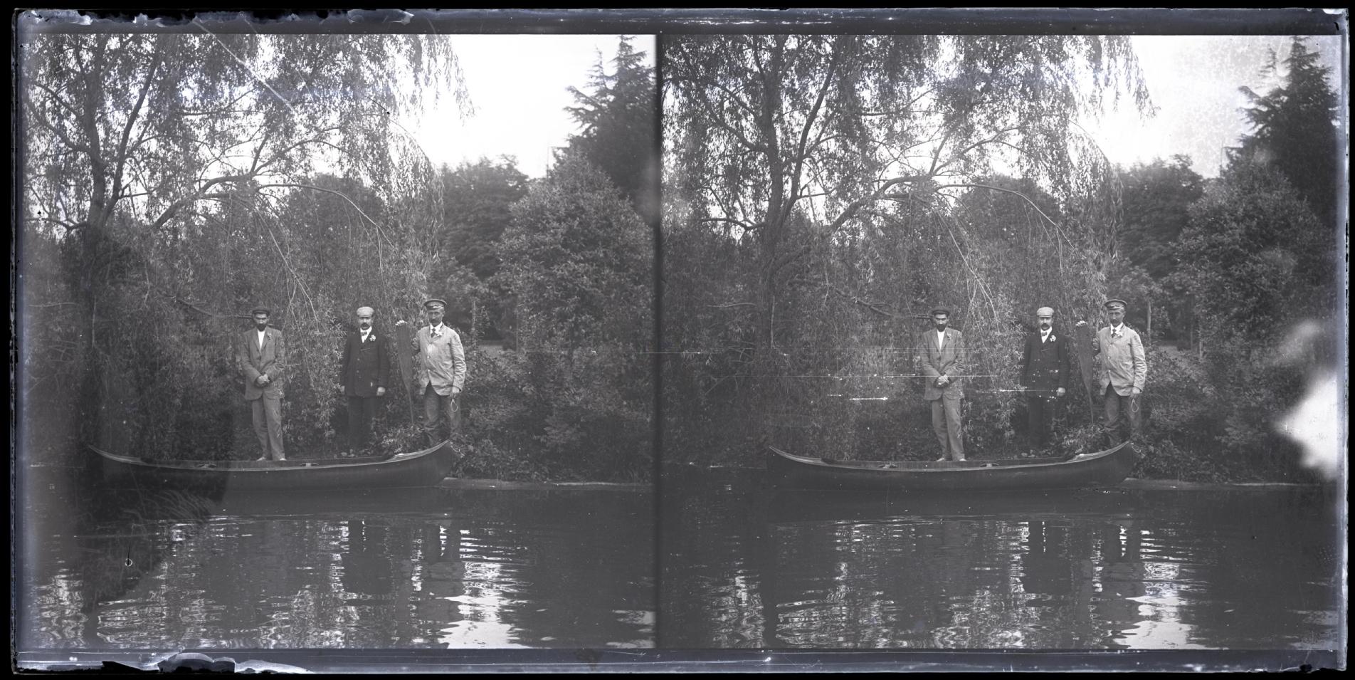 Retrato en plano entero de 3 hombres de pie en la orilla del río junto a una canoa. Los tres con gorra, traje y con una flor en la solapa. El de la derecha, sujeta un remo.