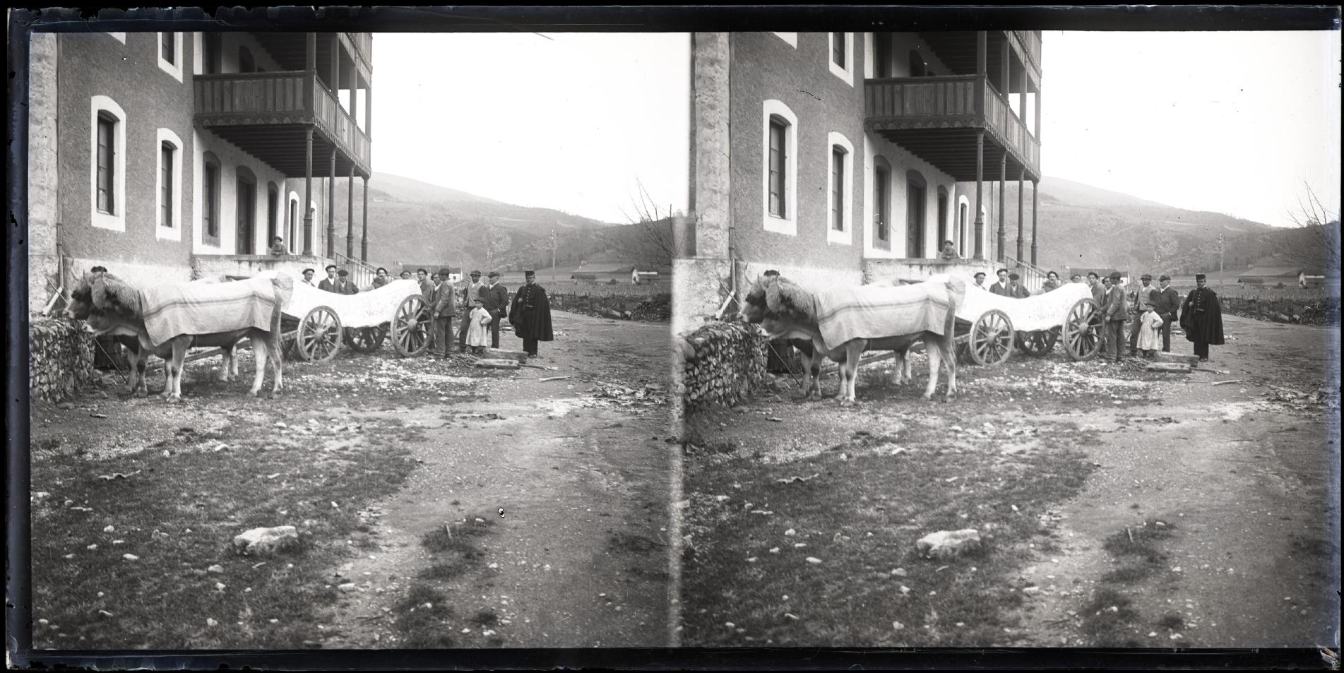 Vista de una yunta de bueyes y un carro cargado con una gran piedra en la fachada de la casa Ochocotonea en Mugaire, junto a la entrada al Señorío de Bertiz. Junto al carro, un grupo de personas.