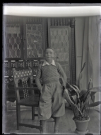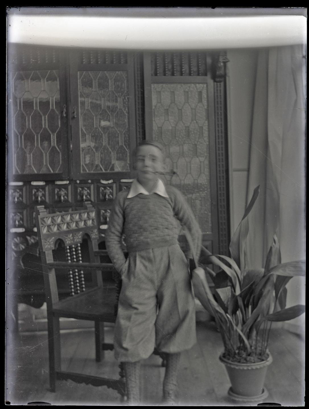 Retrato en plano americano de uno de los hijos de Pedro Azparren Orrio y Águeda Pérez Vidaurreta en un salón con un armario con cristales emplomados, un sillón de madera y una planta.