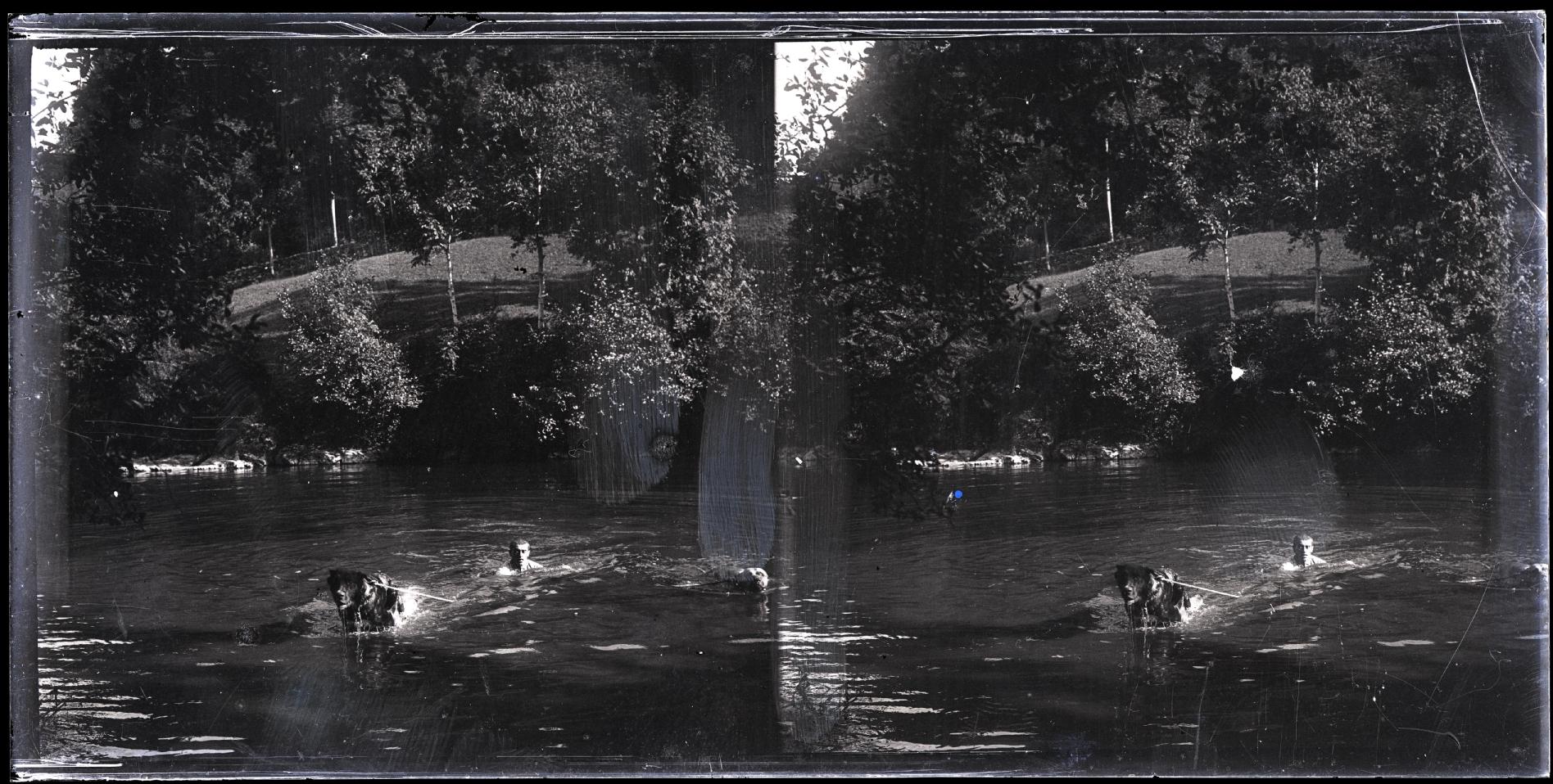 • Título: Un hombre con sus perros bañándose en el río Baztán.