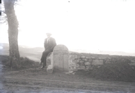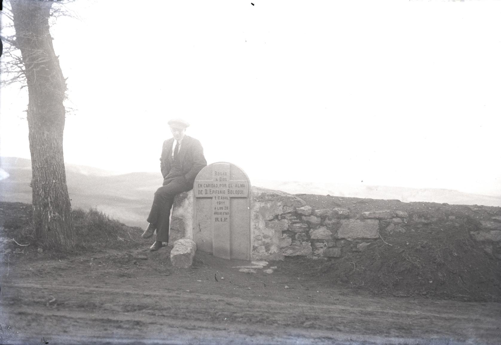 Retrato en plano entero de un hombre sentado en un muro junto a la tumba de Epifanio Boloqui en el Alto del Perdón. En la lápida se lee "ROGAD A DIOS EN CARIDAD POR EL ALAMA DE D. EPIFANIO BOLOQUI. 17 ABRIL 1911 A LOS 28 AÑOS DE EDAD R.I.P."