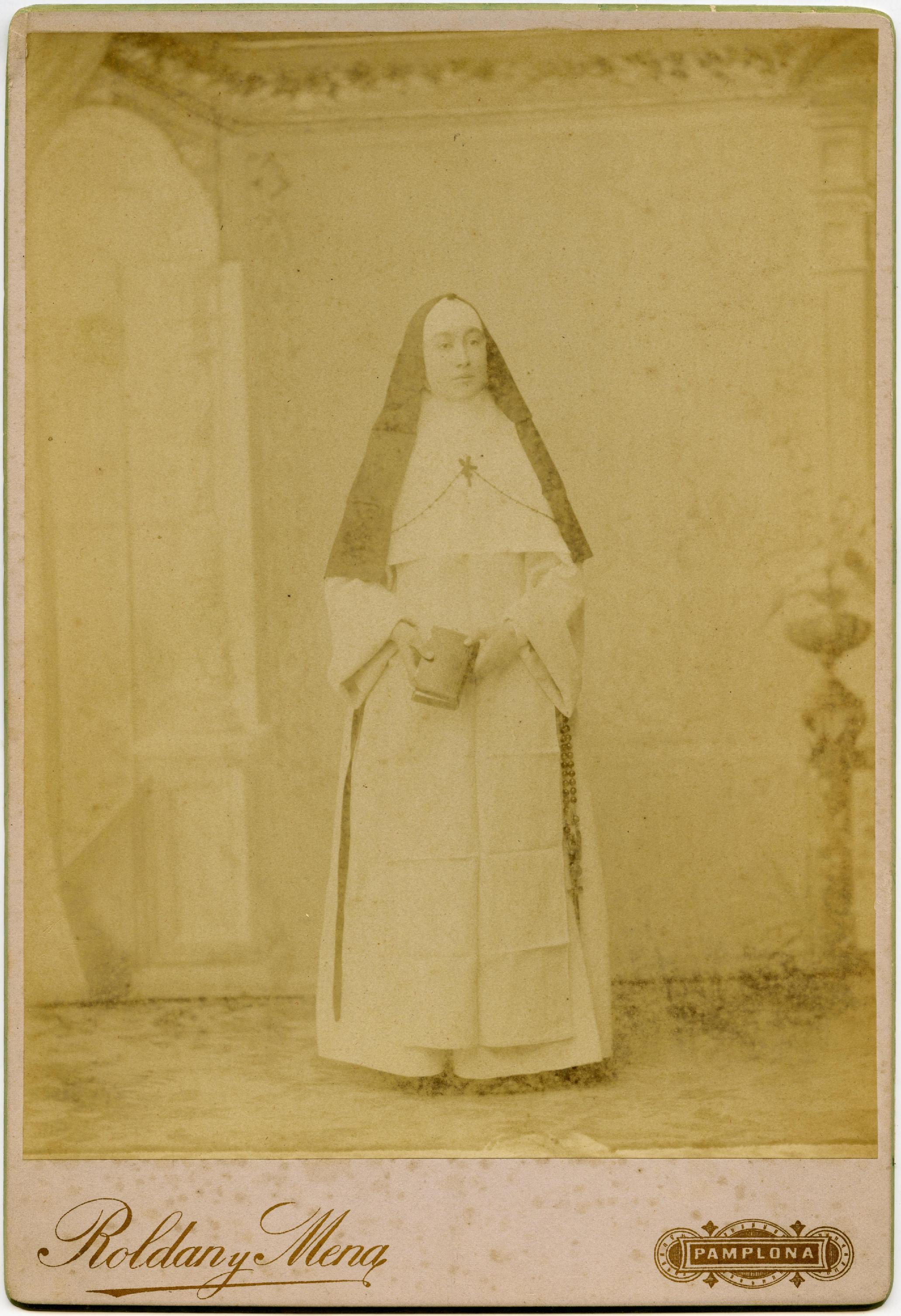 Retrato en plano entero de una de las hijas del matrimonio formado por Martín Esteban Iraizoz Oyarzun y María Fermina Gastesi Erviti con hábito de las Reverendas Madres Dominicas ante un fondo con decoración arquitectónica.
