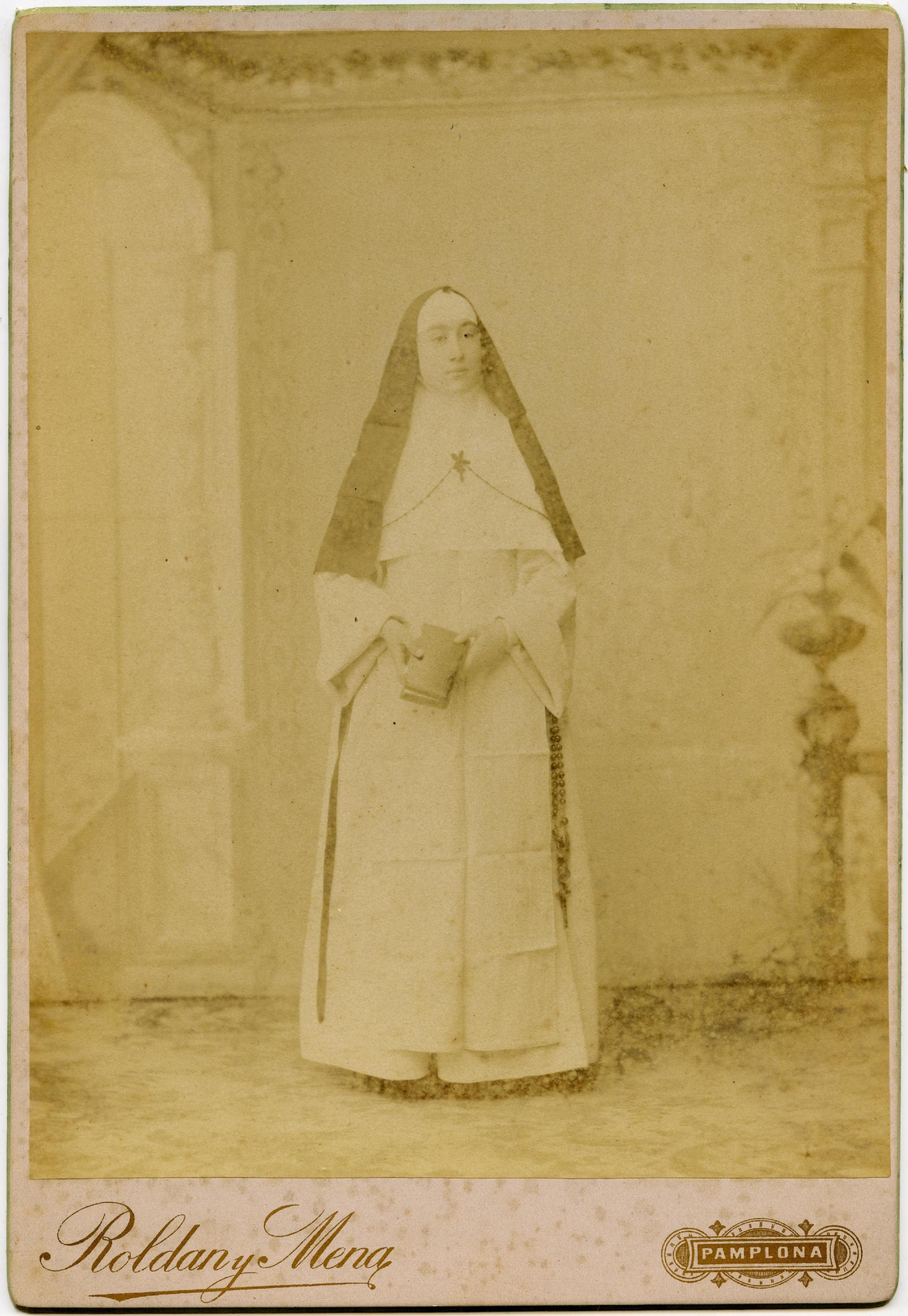 Retrato en plano entero de una de las hijas del matrimonio formado por Martín Esteban Iraizoz Oyarzun y María Fermina Gastesi Erviti con hábito de las Reverendas Madres Dominicas ante un fondo con decoración arquitectónica.