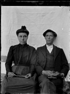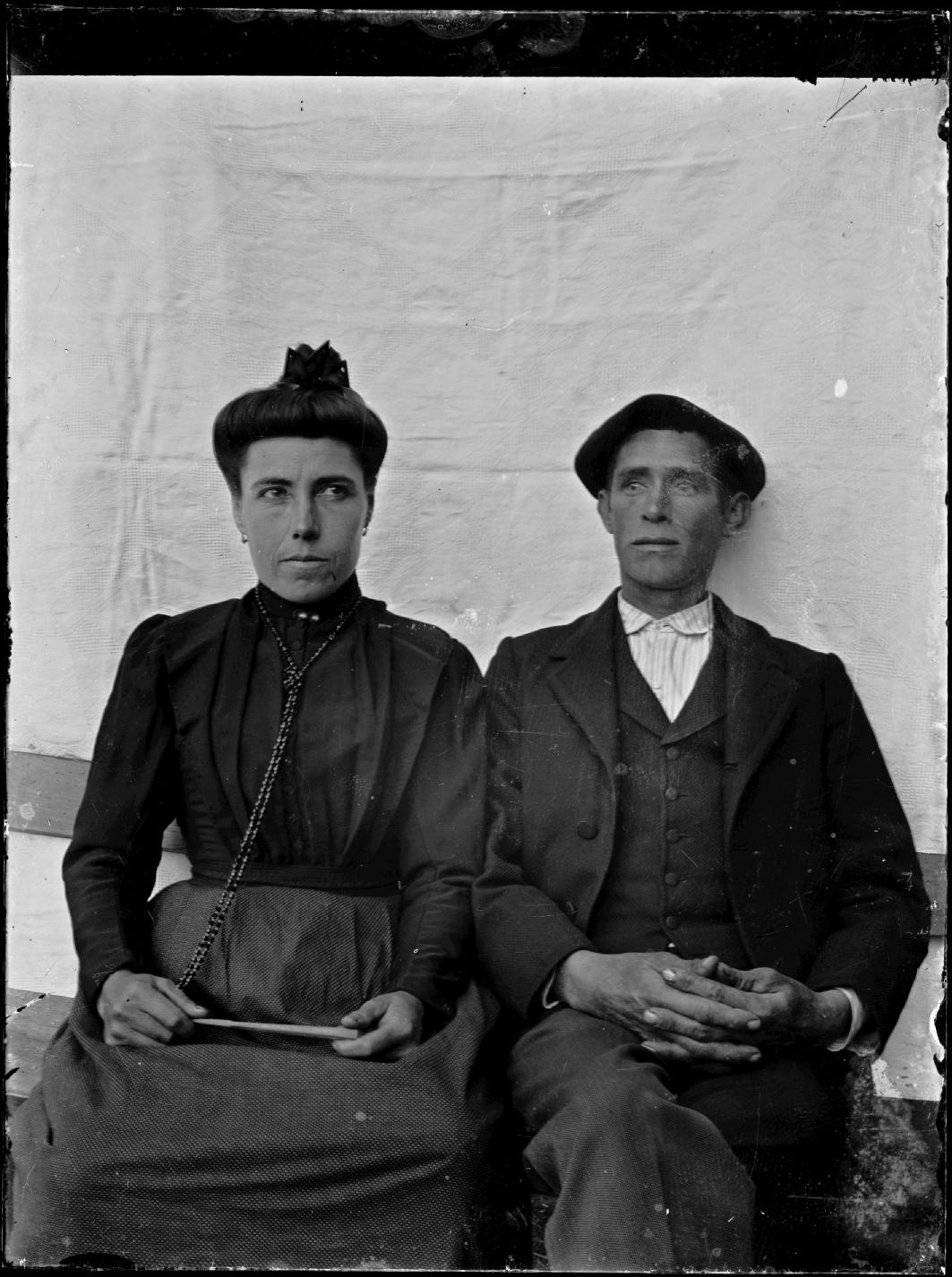 Retrato en plano americano de Crispina Legarrea y, su marido, Urbano Erro, vecinos de casa Landakoa en Esáin, municipio de Anué, sentados.