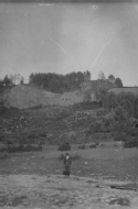 Retrato de un hombre en el valle de Belagua (Isaba), tomado durante una visita del personal de la Dirección de Caminos. En primer término, un hombre en pie. Tras él, una ladera montañosa con pinos.