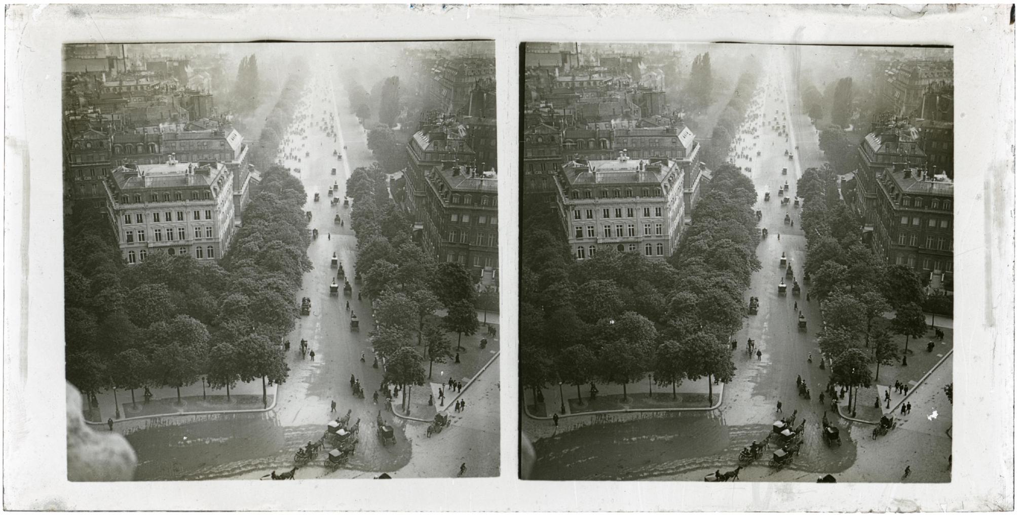 • Contenido: Vista panorámica de París tomada desde la parte superior del Arco del Triunfo. En primer término, un edificio de la plaza Charles de Gaulle. En la derecha, la avenida d'Iéna.