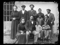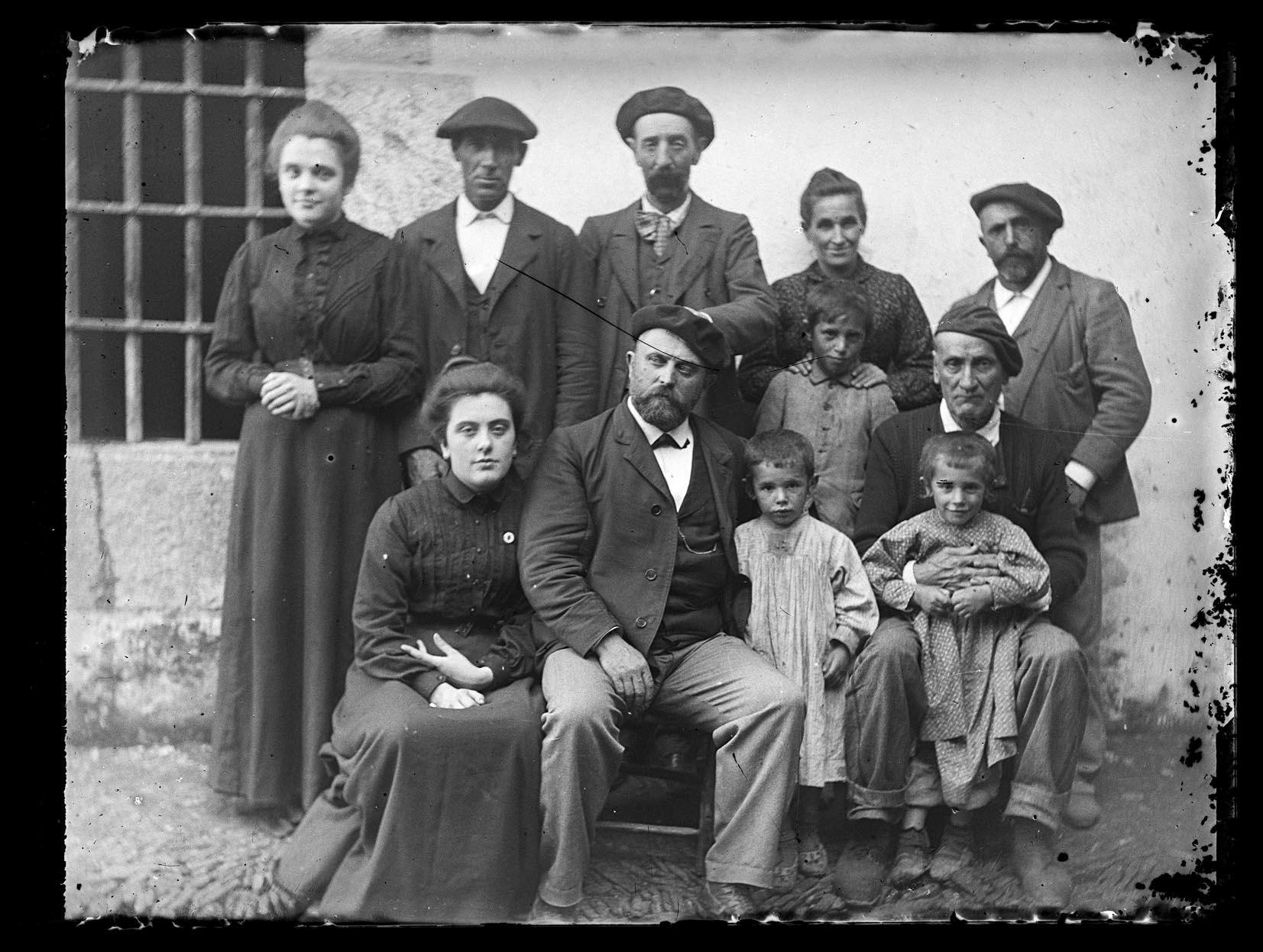 Retrato en plano entero de la familia de Zacarías Astiz Juanmartiñena, sentado en el centro de la imagen. Grupo formado por 3 hombres, 5 hombres y 3 niños.