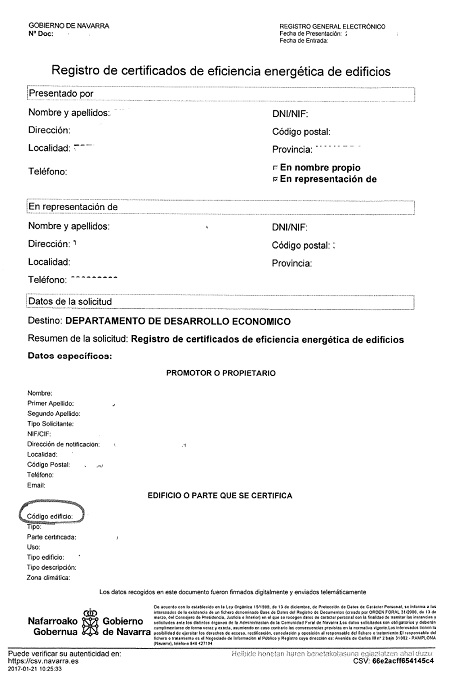 Para que la aplicación del IEE pueda obtener los datos de la Certificación de la Eficiencia Energética del edificio del correspondiente registro, debe indicarse en el campo correspondiente el código del edificio que se genera en el registro de certificaciones energéticas una vez que la certificación está efectivamente incorporada al registro.