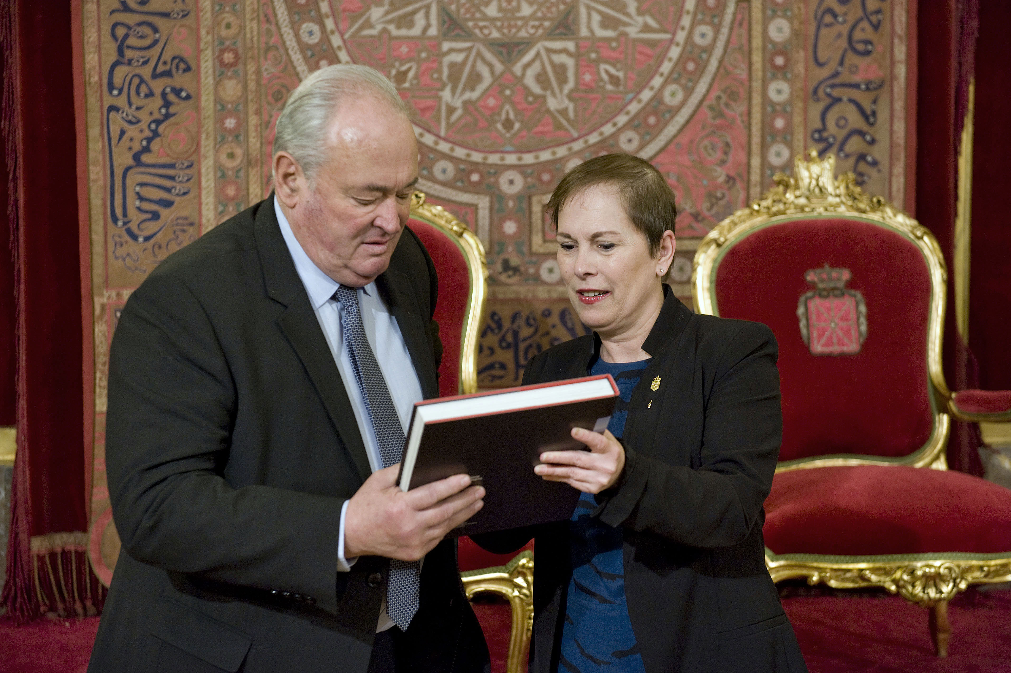Jean-Jacques Lasserrerri liburu bat eman dio Barkos Lehendakariak. (irudia handitu)