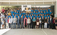 Institutuko ikasle eta abesbatzako kideak erakundeetako ordezkariekin taldeko argazkian.