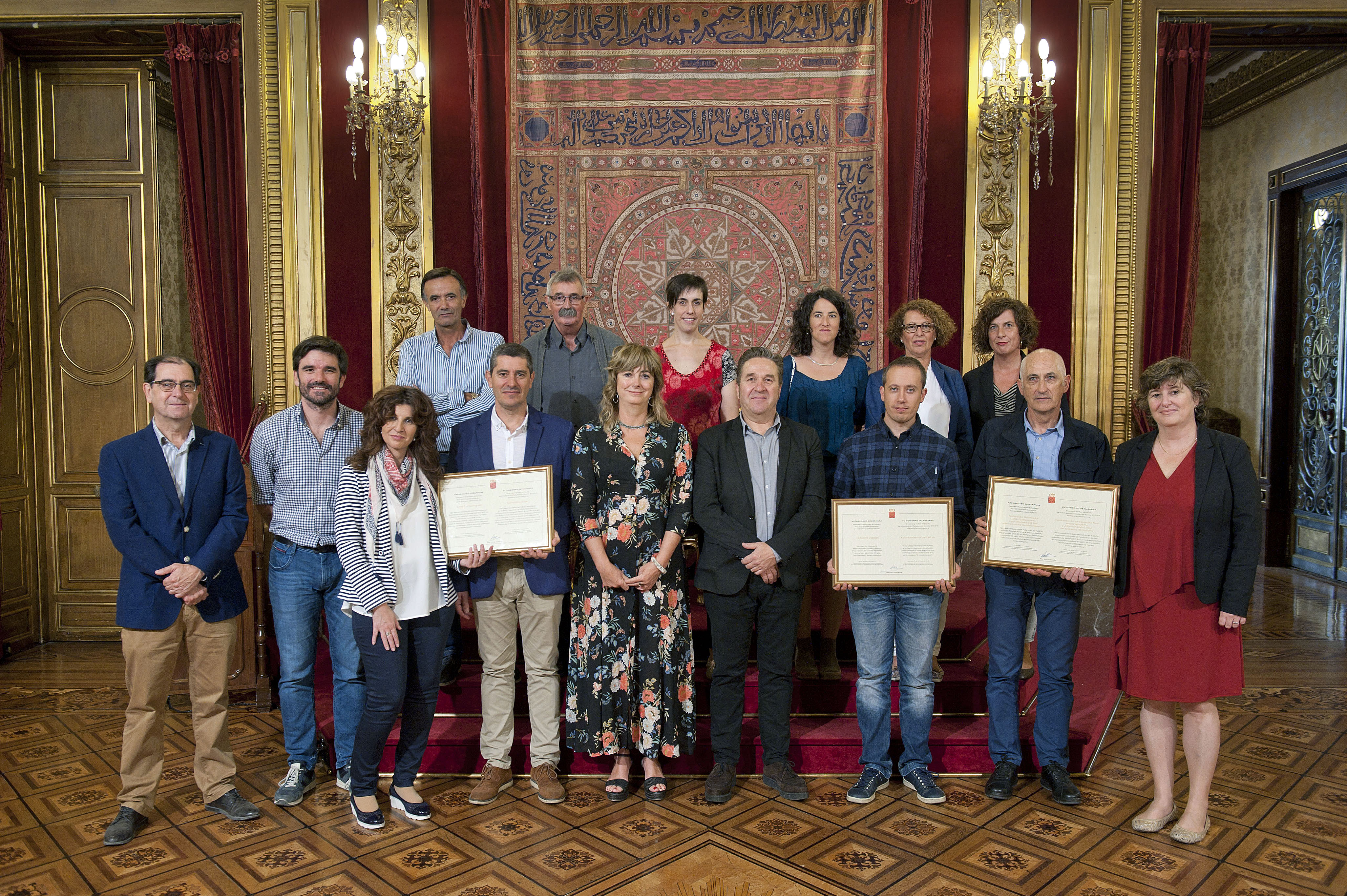 Ollo kontseilaria eta Komunikazioko eta Erakundeekiko Harremanetako zuzendari nagusia, Pello Pellejero, sarituak izan diren erakundeetako ordezkariekin, Tronuen Aretoan.(irudia handitu)