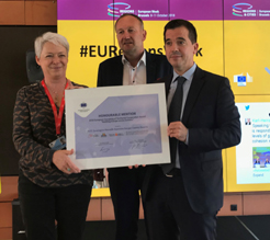 Isabelle Boudineau eta Mikel Irujo, "Transfermuga" mugaz haraindiko proiektuari emandako saria jasotzen. (irudia handitu)