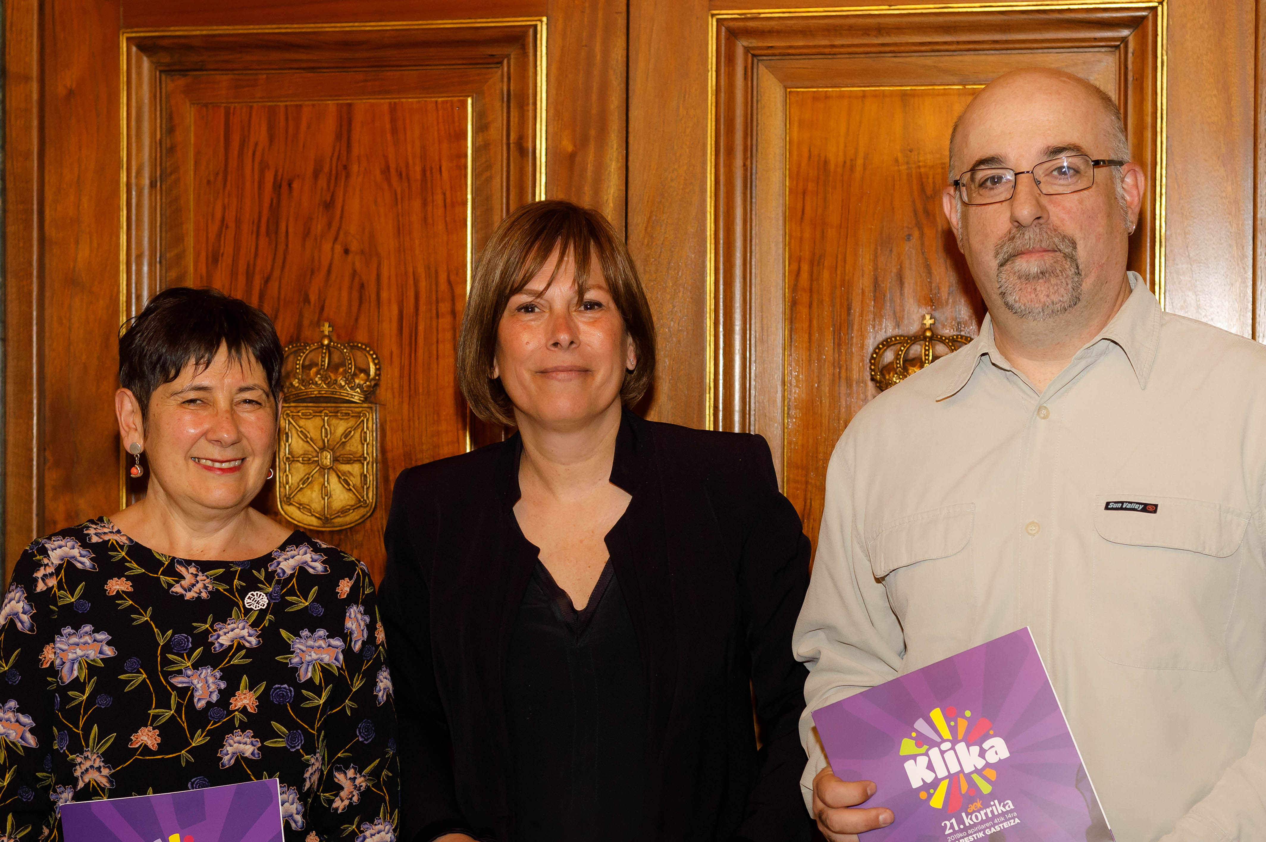 Ezkerretik eskuinera, AEK-ko koordinatzaile nagusi Mertxe Mujika, Barkos Lehendakaria eta 2019 Korrikako arduradun Asier Arrondo.(irudia handitu)