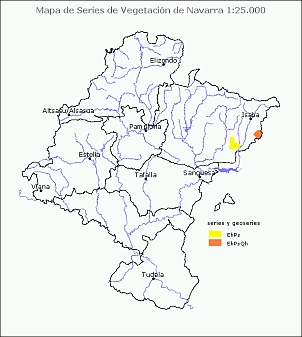 Descripción: la etapa climácica es un pinar de pino royo al que sustituyen bojerales, tomillares submediterráneos prepirenaicos y más raramente matorrales de erizón. Los pastizales de Helictotrichon cantabricum son los más extendidos en el dominio de esta serie, aunque también se encuentran pastizales mesoxerófilos. En Garde, en suelos con mayor humedad de umbrías o zonas altas también hay matorrales de otabera. La delimitación de esta serie de vegetación no resulta sencilla en Navarra, dado que en todo el NE del territorio los pinares de pino royo tienen una presencia generalizada y son tanto climácicos como bosques secundarios de otras formaciones forestales. Esta serie también se ha cartografiado formando parte de una geoserie [EhPsQh] junto a la serie de los robledales pelosos navarro-alaveses. Ecología: piso montano; ombrotipo subhúmedo-húmedo en climas continentales; suelos ricos en bases, generalmente decarbonatados en superficie si la cubierta vegetal es alta, sobre flysch, calcarenitas, calizas o margas. Biogeografía: reg. Eurosiberiana, sec. Pirenaico Central. Distribución: N del puerto de las Coronas, entre Navascués y Burgui y en Garde, en la Sierra de San Miguel y S de Kalbeira. Usos: la mayor parte de su territorio está ocupado por matorrales y pastizales que en algunas zonas aprovecha el ganado ovino, bovino o equino. Los pinares de pino royo, que se manejan para la extracción de madera, ocupan una superficie importante y existen escasos cultivos herbáceos de secano en algunas vaguadas. Faciaciones 1. faciación con matorrales de otabera: además de los matorrales que caracterizan a la faciación anterior, participan matorrales de otabera. 2. faciación con tomillares submediterráneos: los matorrales de sustitución del pinar son bojerales, tomillares submediterráneos prepirenaicos y matorrales de erizón. |