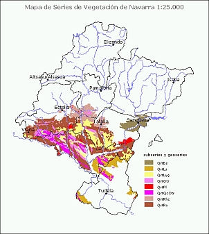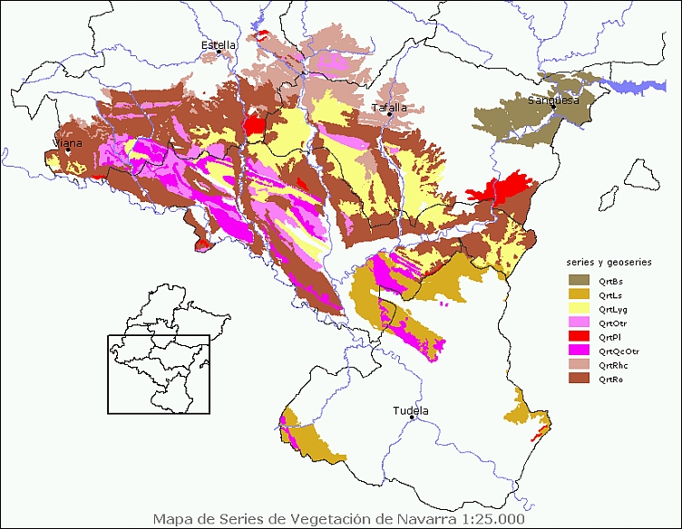 Descripción: la etapa madura es un carrascal con diversas especies (Rhamnus x colmeiroi, Spiraea hypericifolia subsp. obovata, Helictotrichon cantabricum) que indican su carácter transicional hacia los carrascales castellano-cantábricos. Estas plantas también participan en los coscojares castellano-cantábricos que sustituye a estos carrascales; en posiciones más xerófilas son reemplazados por los coscojares riojanos y bardeneros. Los matorrales bajos de sustitución son tomillares, aliagares y romerales riojanos (var. meso-supramediterránea), con plantas como Helictotrichon cantabricum, Arctostaphylos uva-ursi o Thymelaea ruizii habituales en los matorrales de otabera y los tomillares submediterráneos que aparecen más al N cuando la precipitación es superior. En mosaico con estos matorrales suele haber pastizales xerófilos de Brachypodium retusum, que pueden enriquecerse en especies anuales si sufren incendios o sobrepastoreo. Son una rareza los ontinares que se circunscriben a los suelos más nitrificados del entorno de corralizas. Ecología: piso mesomediterráneo; ombrotipo seco superior; suelos sobre areniscas, calizas, conglomerados, limos, arcillas, margas, glacis y terrazas. Es puntual en los yesos entre Arbeiza y Estella, donde desplaza a la faciación gipsícola, por la mayor precipitación de la zona. Biogeografía: reg. Mediterránea, sec. Riojano. Distribución: área principal alrededor de Monte Eskinza (Villatuerta, Cirauqui, Mañeru), Altos de Ibarbero (N de Mendigorría y Artajona), S de la Sierra del Perdón, Valdizarbe, Valdorba y El Plano (Tafalla); al O aparece en las solanas de Montejurra y al S de las Sierras de Cábrega y Las Llanas hacia Viana. Usos: la mayor parte del territorio está dedicado al cultivo en secano, sobre todo de herbáceos; los cultivos leñosos son viña, olivo y almendro. A pesar de ello, la vegetación natural, sobre todo arbustiva, está bien representada, con tomillares y coscojares. Es una de las faciaciones de la serie donde quedan más muestras de carrascal, como sucede en El Plano de Tafalla-Olite. |