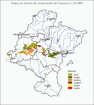 Descripción: la etapa climácica es un quejigal con boj y coscoja. Al quejigal le acompaña una orla de espinar con boj. Se diferencia de las faciaciones supramediterráneas, además de por el tipo de bosque, por los coscojares castellano-cantábricos. Los matorrales bajos más frecuentes son los tomillares y aliagares riojanos (var. meso-supramediterránea) aunque también se encuentran tomillares submediterráneos y más raramente matorrales de otabera. Los matorrales forman mosaico con pastos submediterráneos de Brachypodium retusum; sobre suelos con mayor capacidad de retención hídrica hay fenalares y pastizales mesoxerófilos. El boj está presente tanto en el bosque como en los matorrales de sustitución. Ecología: piso mesomediterráneo y supramediterráneo, altitud 380-860 m; ombrotipo subhúmedo; suelos sobre calizas, areniscas, conglomerados, flysch, margas, arcillas, derrubios de ladera. Biogeografía: reg. Mediterránea, sec. Castellano-Cantábrico, puntual en el sec. Somontano-Aragonés; reg. Eurosiberiana, puntual en el subsec. Navarro-Alavés. Distribución: Belastegi (confluencia de los ríos Urederra y Ega N de Estella); S de la Sierra de Ipasate hacia el río Arga y caíadas de la Sierra del Perdón hacia Valdizarbe; Monte Guerinda, umbría de la Sierra de Gallipienzo y solanas de Santa Ágata, val de Aibar (Sada, Leache); Peña Izaga (Alzórriz), N de Aoiz y Lónguida y solana de Leire. Usos: la vegetación natural está bien representada, sobre todo por matorrales (coscojares y tomillares), pastizales y algunos quejigales. Las repoblaciones forestales también son comunes, y en ellas se emplea el pino carrasco (Pinus halepensis) y el laricio (P. nigra). Los cultivos de secano ocupan una reducida extensión, dominando los herbáceos. |